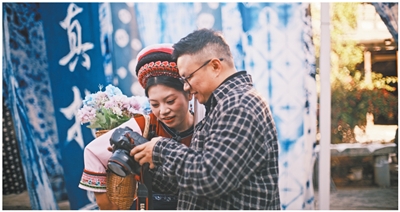 云南大理白族自治州,游客(左)与摄影师一起挑选照片。