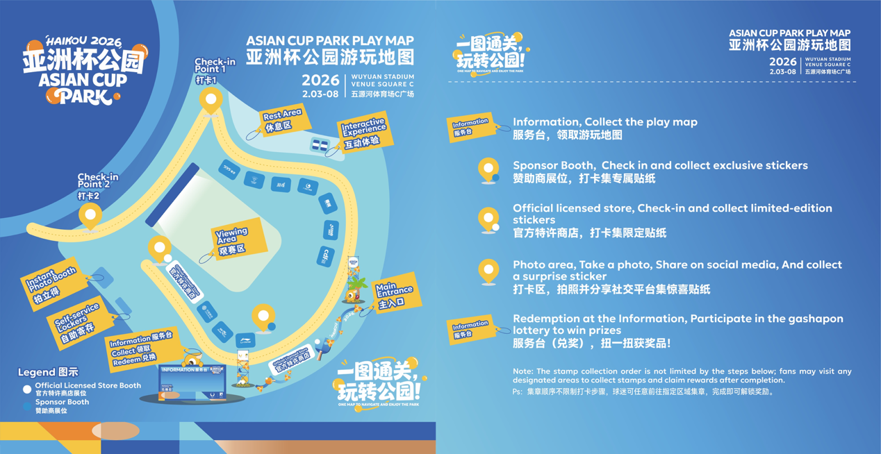 为丰富赛事体验,赛事期间,配套打造的“亚洲杯公园”将于2月3日至8日在五源河体育场C广场同步开放。园区围绕“欢聚海口城,共享亚洲杯”主题,旨在打造一个集激情观赛、沉浸互动、文化体验与多元消费于一体的综合性空间,突破传统观赛模式,实现“场内专业竞技、场外精彩纷呈”的全域体验升级,为球迷与游客献上一场立体多元的文体盛宴。