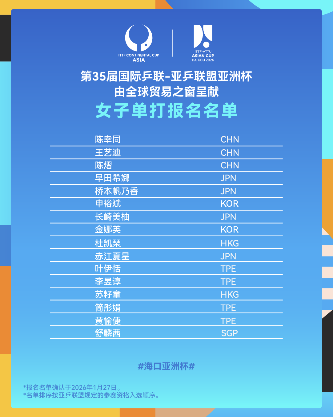 附:海口亚洲杯参赛运动员报名名单