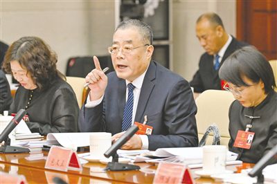 2月6日,通辽市代表团王立强(中)代表在审议法检两院工作报告时建议,进一步加强司法队伍建设,全面提升司法工作人员的政治素养和业务能力。记者 王磊摄