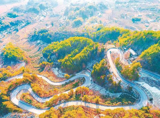 1月22日,岳西县,蜿蜒公路与民居、群山互相映衬,绘就一幅和美乡村冬日画卷。