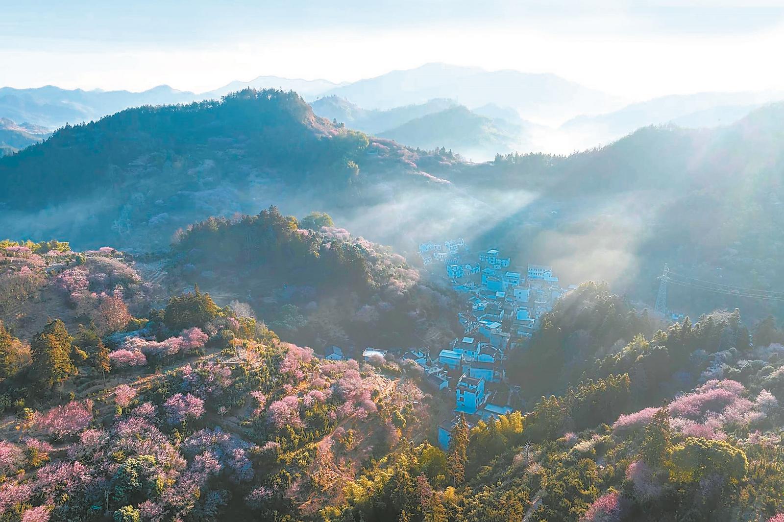 2月9日,黄山市歙县雄村镇卖花渔村,漫山遍野的梅花次第绽放,花海与徽派村落民居相映成趣,景美如画,吸引游客前来观赏。本报通讯员 樊成柱 摄