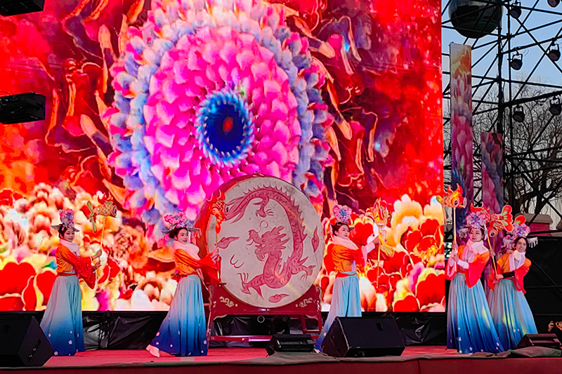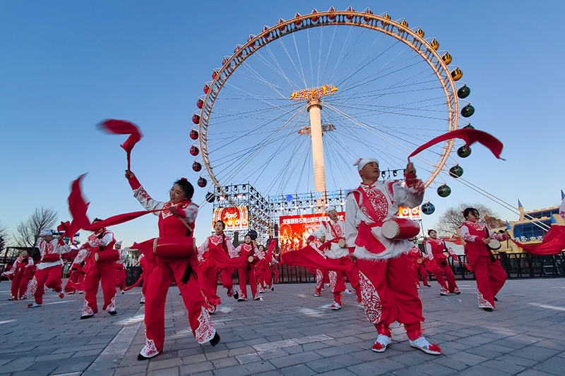 活动内容丰富多彩,集非遗表演、光影艺术、特色美食、趣味互动于一体。文艺演出板块精心策划四大主题,全天共计21场精彩节目轮番上演:气势恢宏的非遗安塞腰鼓、年味浓郁的舞龙舞狮、绚丽夺目的“火龙钢花”演绎“龙在火中飞”的奇观;“时空穿越”主题花车与鱼灯巡游巧妙融合国潮风尚与非遗韵味,摩天轮舞台持续献上中西荟萃的歌舞表演,更有全民参与的“新春蹦迪”环节点燃欢乐气氛。