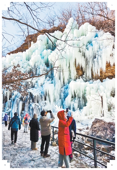 北京市平谷区鱼子山村的冰瀑吸引游客打卡。