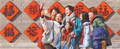 游客在甘肃兰州市七里河区兰州老街“福”字墙前合影留念。 侯崇慧摄(人民视觉)