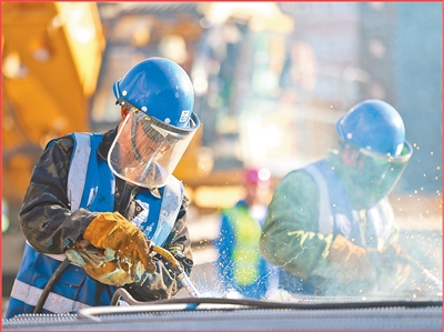 施工人员在天津地铁八号线一期工程六里台站建设现场进行钢筋笼焊接作业。