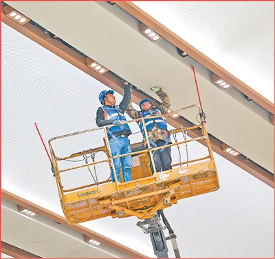 工人在由中铁建工承建的河北雄安新区雄安城际站候车大厅顶部进行装饰装修。