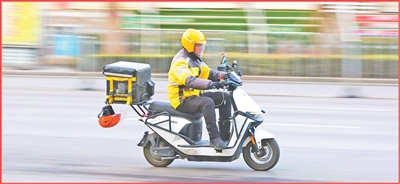 一名外卖骑手在山东省滕州市为顾客配送外卖。