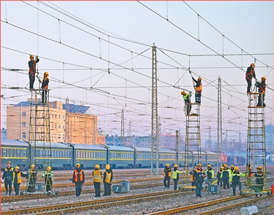 河南省新乡市,国铁集团郑州局新乡供电段接触网工正在检修京广线新乡站接触网定位器、分段绝缘器等供电设施。
