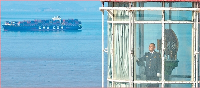浙江省舟山市岱山县下三星岛,东海航海保障中心宁波航标处下三星灯塔主任黄海松从1982年起在灯塔上值守巡检,为往来船舶提供指引和保障。这个春节是他在岛上值守的最后一个春节。图为黄海松在灯塔上瞭望海面情况。