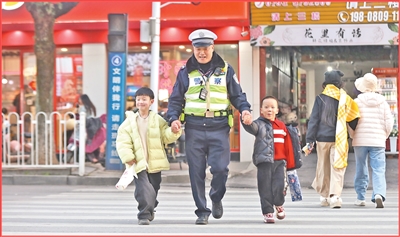 江西省横峰县公安局交通管理大队民辅警在执勤时护送小朋友过马路。