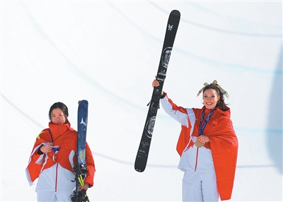 图为谷爱凌(右)和李方慧在颁奖仪式上。