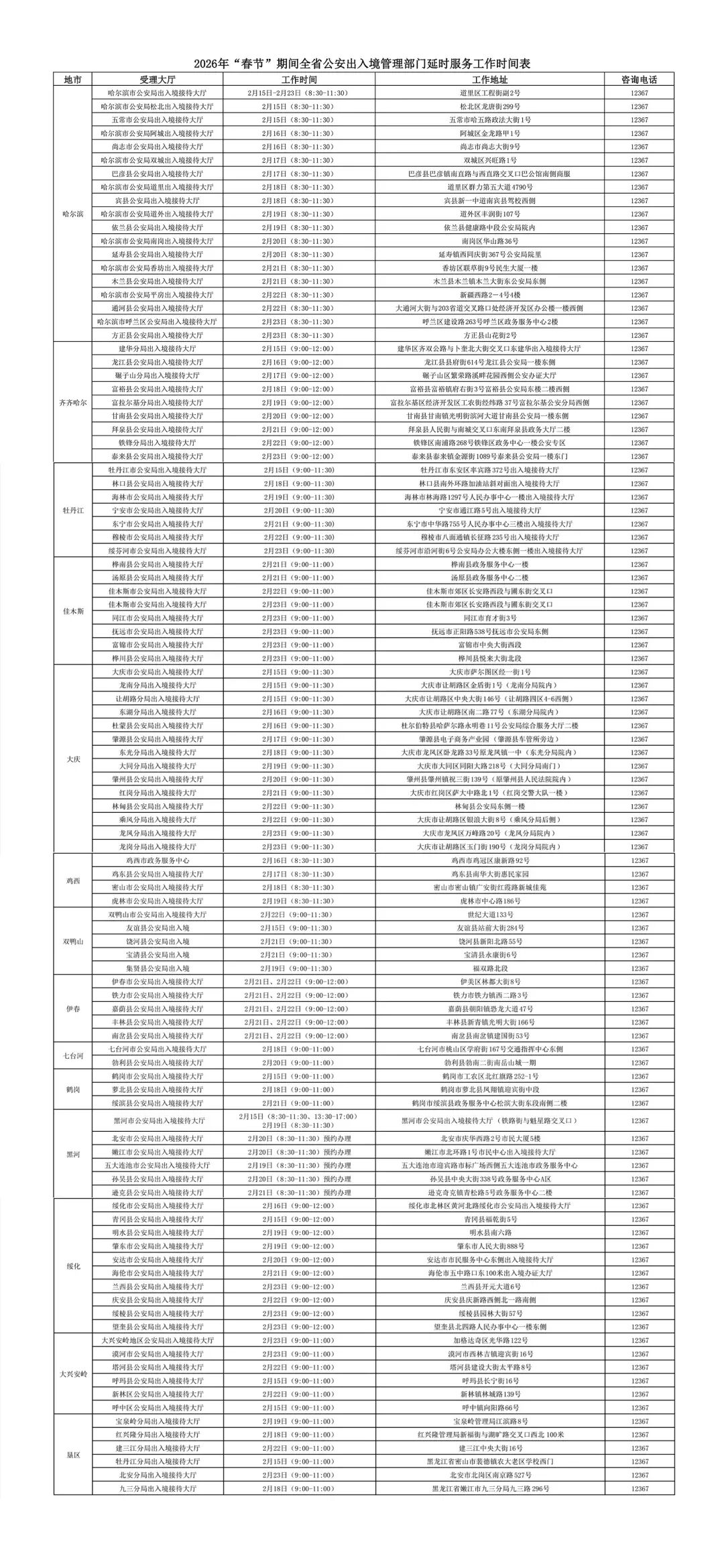 春节假期将至,为确保广大群众顺利办理出入境证照,黑龙江省各级公安出入境管理部门精心安排窗口工作时间,坚持“服务不打烊、办证不间断”。省公安厅汇总发布全省公安出入境窗口春节服务时间表,方便您合理安排办证计划。