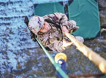 近日,武警天津总队机动支队开展综合体能强化训练。图为一名战士在爬绳攀登。本报特约记者 宫 旭摄