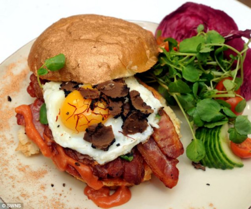 这个三明治胜在用料十足,除了切片松露、番红花,以及由稀有品种猪肉制成的烟培根等名贵食材外,还在表面洒上可食用的金箔,配以“华丽培根”(Bacon Bling)的名称,可谓相当贵气。