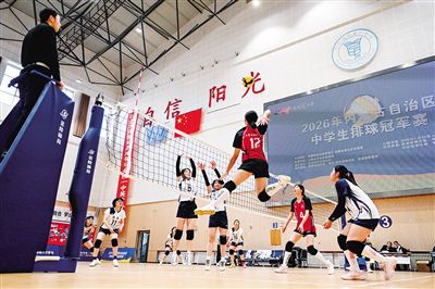 1月28日,呼和浩特市第一中学排球馆内,队员们正在赛场上激烈角逐。1月26日,2026年内蒙古自治区中学生排球冠军赛激情开赛,比赛为期8天。此次比赛由自治区教育厅、体育局联合主办,呼和浩特市教育局承办,作为自治区顶级中学生排球赛事,吸引了来自9个盟市的47支代表队、882人参赛。记者 王晓博摄