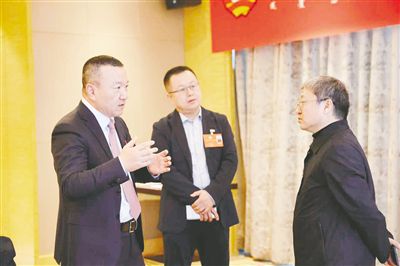 2月6日,自治区政协委员牛惠军(左)与自治区政协委员王三民(中)、曹思阳就加大电网建设投资力度,优化完善电力输送网络,充分释放我区能源产业发展潜力等进行交流。记者 贾奕村摄