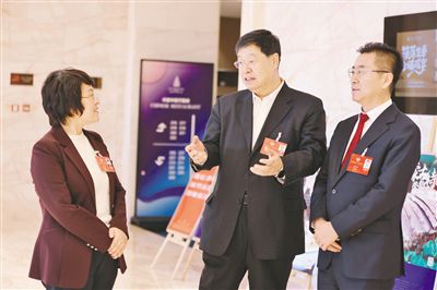 2月5日下午,自治区政协常委杜凤莲(左)与自治区政协委员马保国(中)、郭建君就打造我国向北开放重要桥头堡进行交流。记者 贾奕村摄