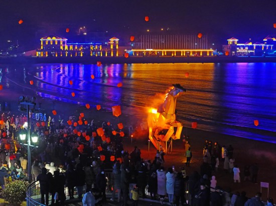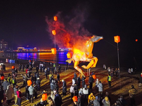 夜幕降临,“赤骥腾春 好运环翠”2026新春嘉年华活动准时开演,主题光影秀、非遗鱼灯巡游、打铁花等节目轮番上演,营造出滨海“不夜天”的热闹景象。尤其是“赤骥腾春”艺术灯光秀,将奔驰的赤骥与灯光、烟雾融合,呈现出富有视觉冲击力的艺术景观。“这个装置主体由废旧钢铁、快递箱纸壳等回收材料构建而成,体现了绿色环保的理念。”赤骥设计师郑旭光介绍。