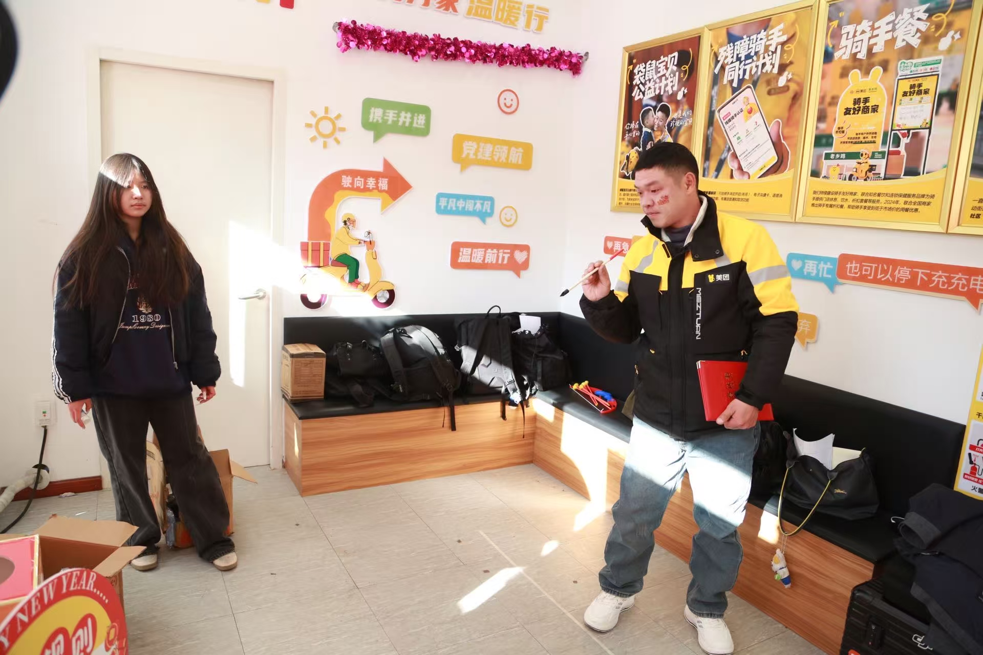 位于青浦区徐泾镇的“骑手之家”的玻璃门上贴着的福字,却透着一丝暖意——这里前几日刚举行了一场骑手新春联欢活动。