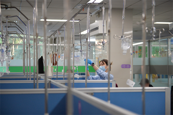 巡回区护士正在为患者更换补液,同时认真核对患者与药物信息,密切观察穿刺部位及全身反应,并及时向患者说明用药注意事项。人民网记者 龚莎摄