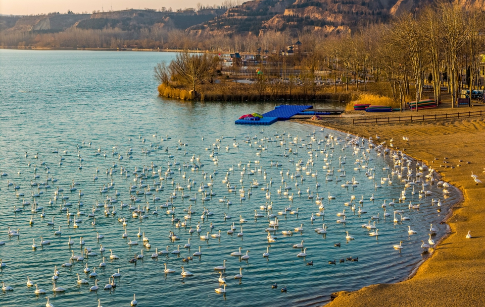 1月13日,芮城县圣天湖景区,成群的白天鹅沐浴在晨光里,与湖光山色构成诗情画意的美景。近年来,当地不断加大对圣天湖生态环境的保护力度,为白天鹅越冬打造了温馨家园,越冬栖息的白天鹅数量也随之逐年增多。(薛俊摄)