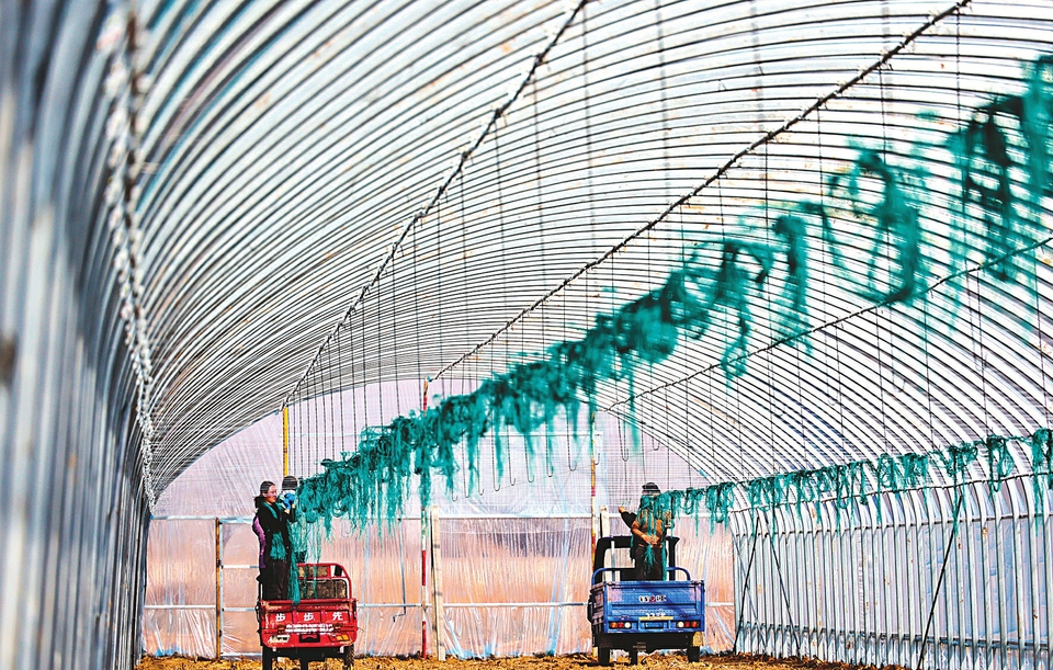 1月12日,在新绛县三泉镇席村,菜农正加紧建设新型节能日光温室蔬菜大棚,全力保障设施蔬菜种植,构成冬日田园里一道亮丽风景线。(高新生摄)