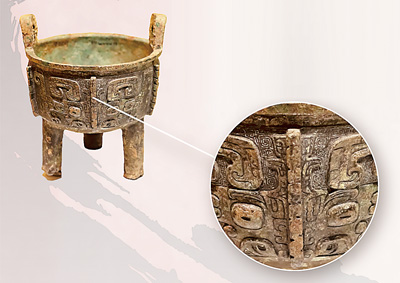 商代兽面纹铜鼎上的兽面纹。