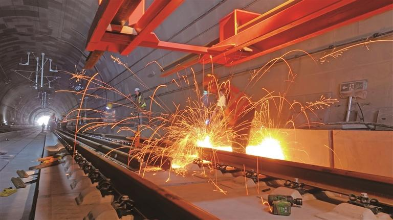 2月6日,西康高铁全线完成铺轨。图为最后一对钢轨在安康西站铺轨现场精准落位并完成焊接锁定。 记者 杨光摄