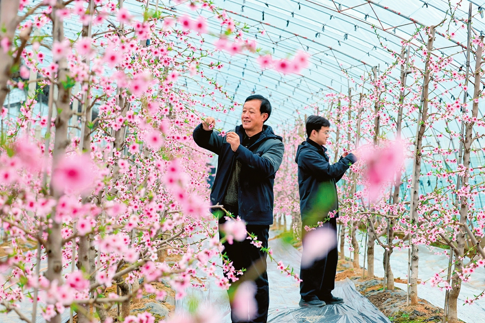立春时节,万荣县通化镇西孝原村大棚里桃花盛开,果农抢抓农时开展桃树管护,确保增产丰收。近年来,当地将种植采摘与观光休闲相结合,按照规模化、标准化、产业化经营,推动农旅融合、促进农民增收。(闫鑫摄)