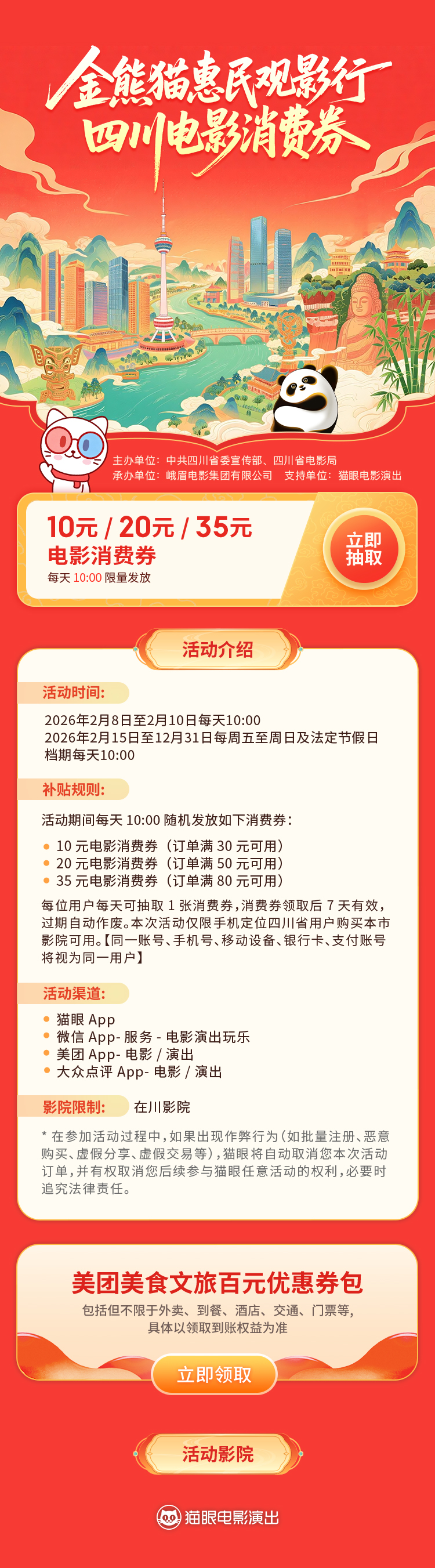 观影热潮的背后,是实打实的惠民举措与持续创新的消费场景。这个春节,“跟着电影赶大集”暨四川新春电影生活季在成都火热开展,作为活动核心板块,2026“金熊猫惠民观影行”电影消费券项目在全省发放总额高达4800万元,通过“满减优惠”“免费专场”等灵活形式,持续降低市民观影门槛,预计将撬动超过200万人次的电影消费。