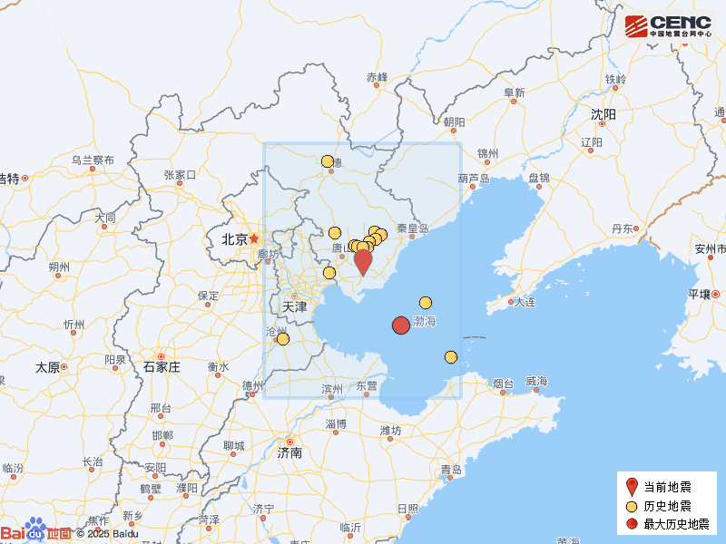 历史地震:根据中国地震台网速报目录,震中周边200公里内近5年来发生3级以上地震共16次,最大地震是2025年7月27日在渤海海域发生的4.4级地震(距离本次震中123公里),历史地震分布如图。