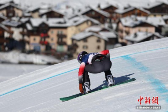 当地时间2月13日,2026年米兰-科尔蒂纳冬奥会单板滑雪女子障碍追逐比赛在利维尼奥雪上公园举行。中国选手拥青拉姆以1分17秒07预赛排名第26位,止步首轮淘汰赛。图为拥青拉姆在首轮淘汰赛中。中新社记者 富田 摄