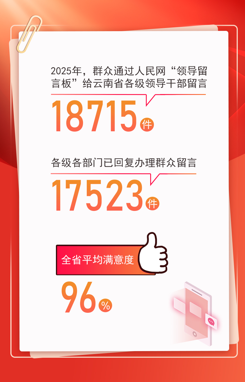 网聚民声,情暖云岭;留言有应,枝叶关情。云南省各地各部门始终把人民网“领导留言板”作为践行网上群众路线、畅通民意诉求的重要阵地,用心倾听每一声群众呼唤,用力办好每一件民生实事。每一次办结都是一次民心凝聚。今天,人民网云南频道推出2025云南省网上群众工作盘点,带您回顾那些暖心事。