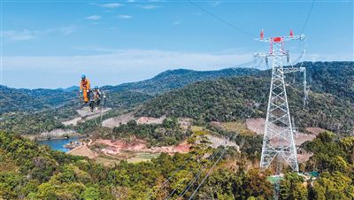 图为2月5日,施工人员在输电导线跨国连通处作业。新华社记者 彭奕凯摄