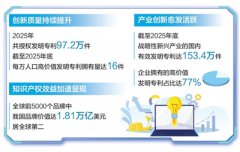 1月23日,国务院新闻办举行新闻发布会,介绍2025年知识产权工作进展。2025年,我国共授权发明专利97.2万件,受理PCT国际专利申请7.8万件,注册商标420.6万件。截至2025年底,我国国内发明专利有效量达532万件,每万人口高...